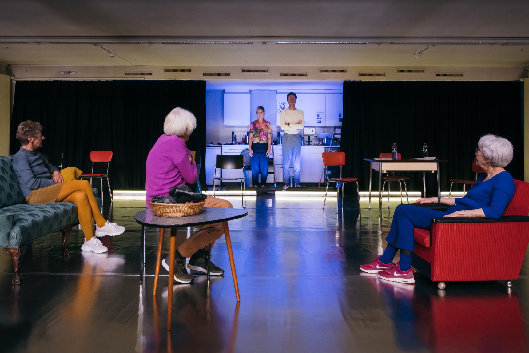 Das Theaterstück «HEUTE ÜBER MORGEN» ist das grosse Finale der ersten der drei Phasen von Proberaum Zukunft. Die gesammelten Erfahrungen, Entdeckungen und Erkenntnisse aus der Recherche- und Workshopphase treffen auf die Biografien von Hansjürg Rohner, Anna-Maria Walgis und Rosmarie Wipf. Sie verdichten sich im Schatten der Pandemie zu einer kritischen Reflexion des Gesamtprojekts Proberaum Zukunft.