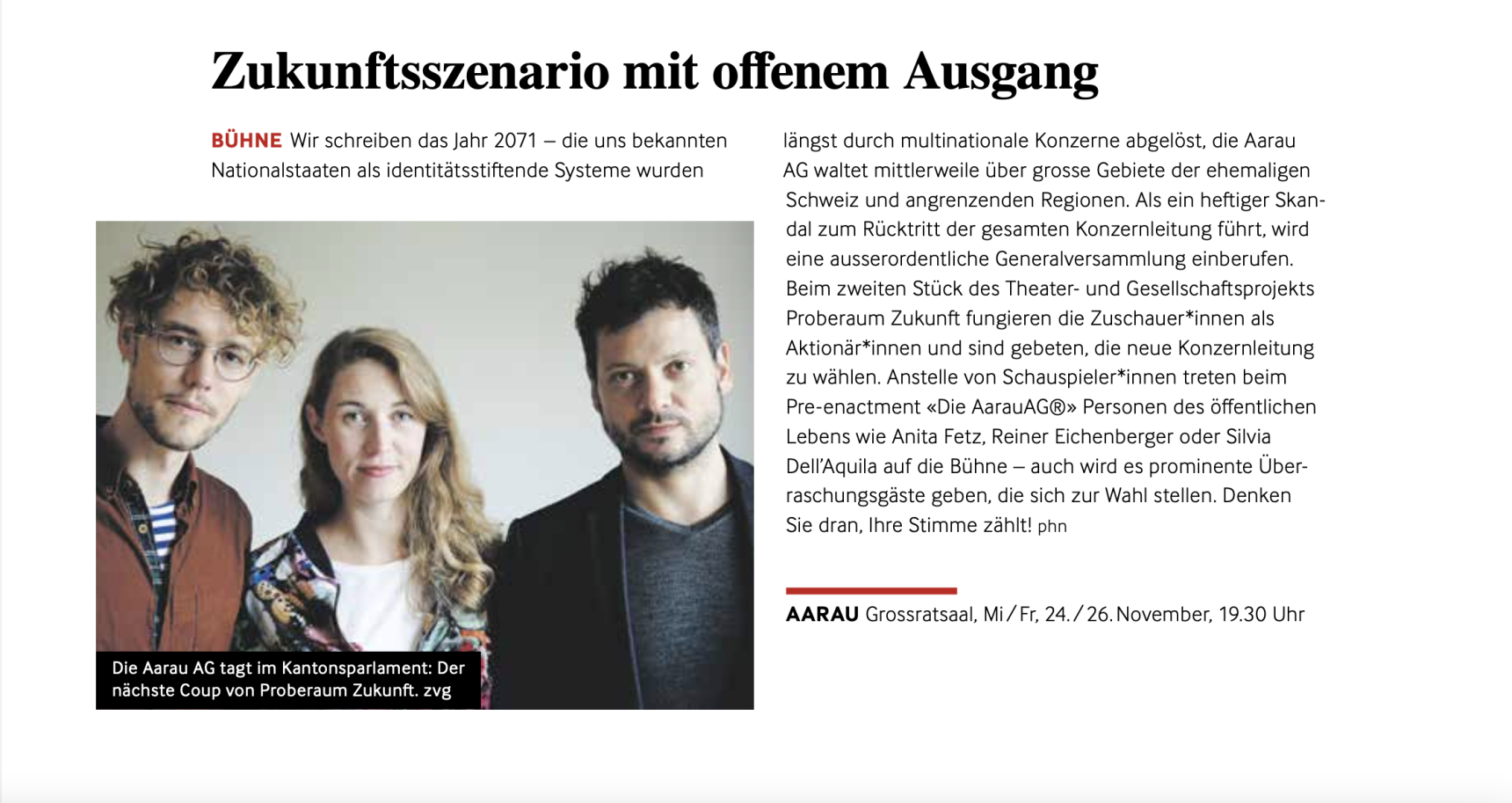 Die mehrjährige Szenotop-Residenz des Aargauer Kuratorium ermöglichte uns als Theaterkollektiv, Mittel und Wege zu entwickeln, Denk- und Handlungsräume zu designen, in denen das Publikum – oder besser gesagt: die Teilnehmenden – Situationen der Zukunft im Hier und Jetzt erproben können. Dieses Vorproben einer möglicherweise eintretenden Realität soll mit dem Abschluss der Residenz kein Ende nehmen. Auch unabhängig von Residenzen und Theaterinstitutionen öffnet Proberaum Zukunft seine Türen, wie beispielsweise 2019 in der Zusammenarbeit mit dem Stapferhaus Lenzburg. Unser nächstes Ziel ist es, das Format der «AarauAG» in andere Städte und Parlamente zu exportieren; dann natürlich nicht mehr mit «Aarau» im Titel, aber mit dem Handwerk im Gepäck, das wir dank der Residenz des Kantons Aargau erwerben durften.